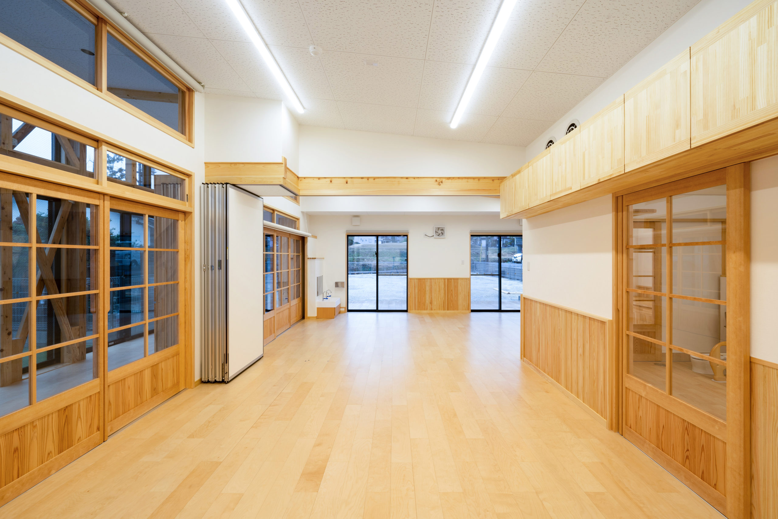 保育室では、木材と自然光の融合と仕切りも可能な広々とした空間に仕上げています。