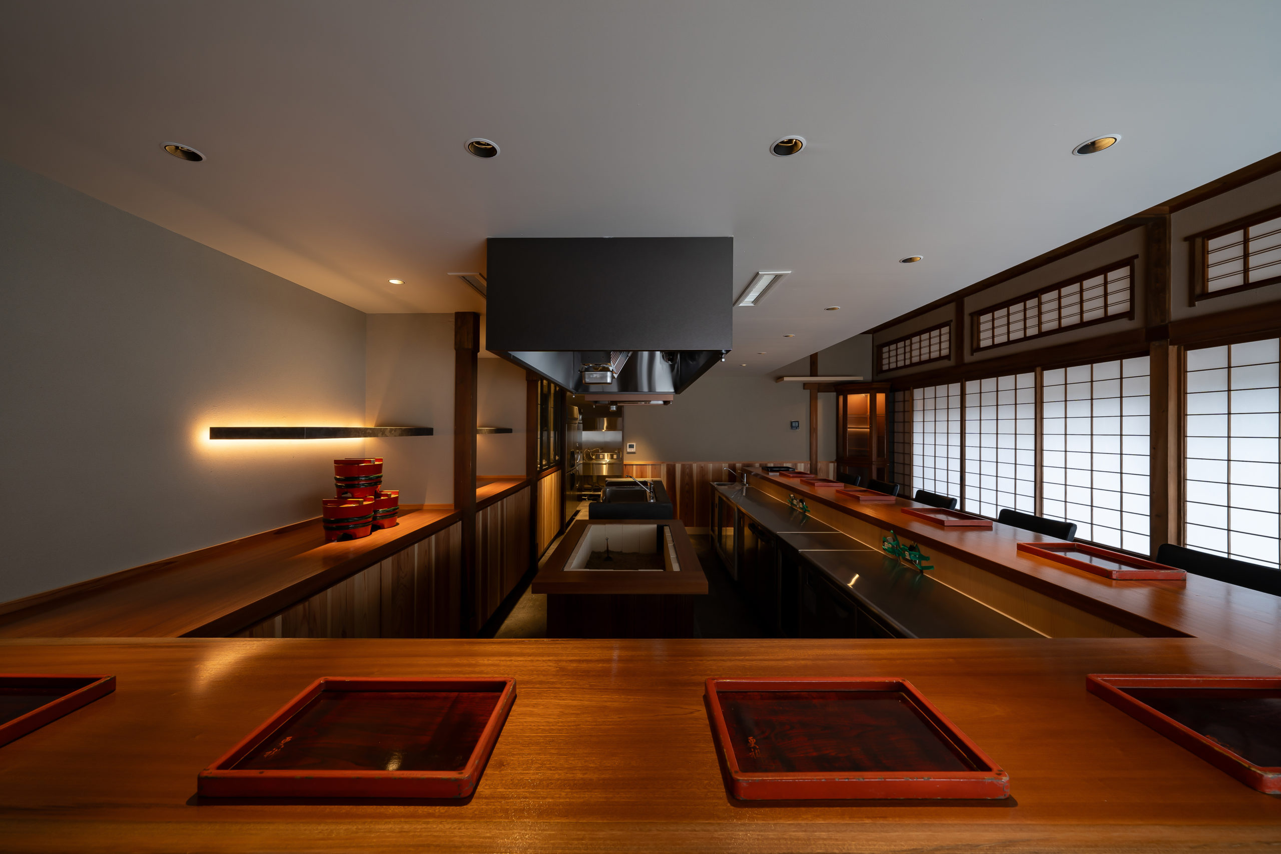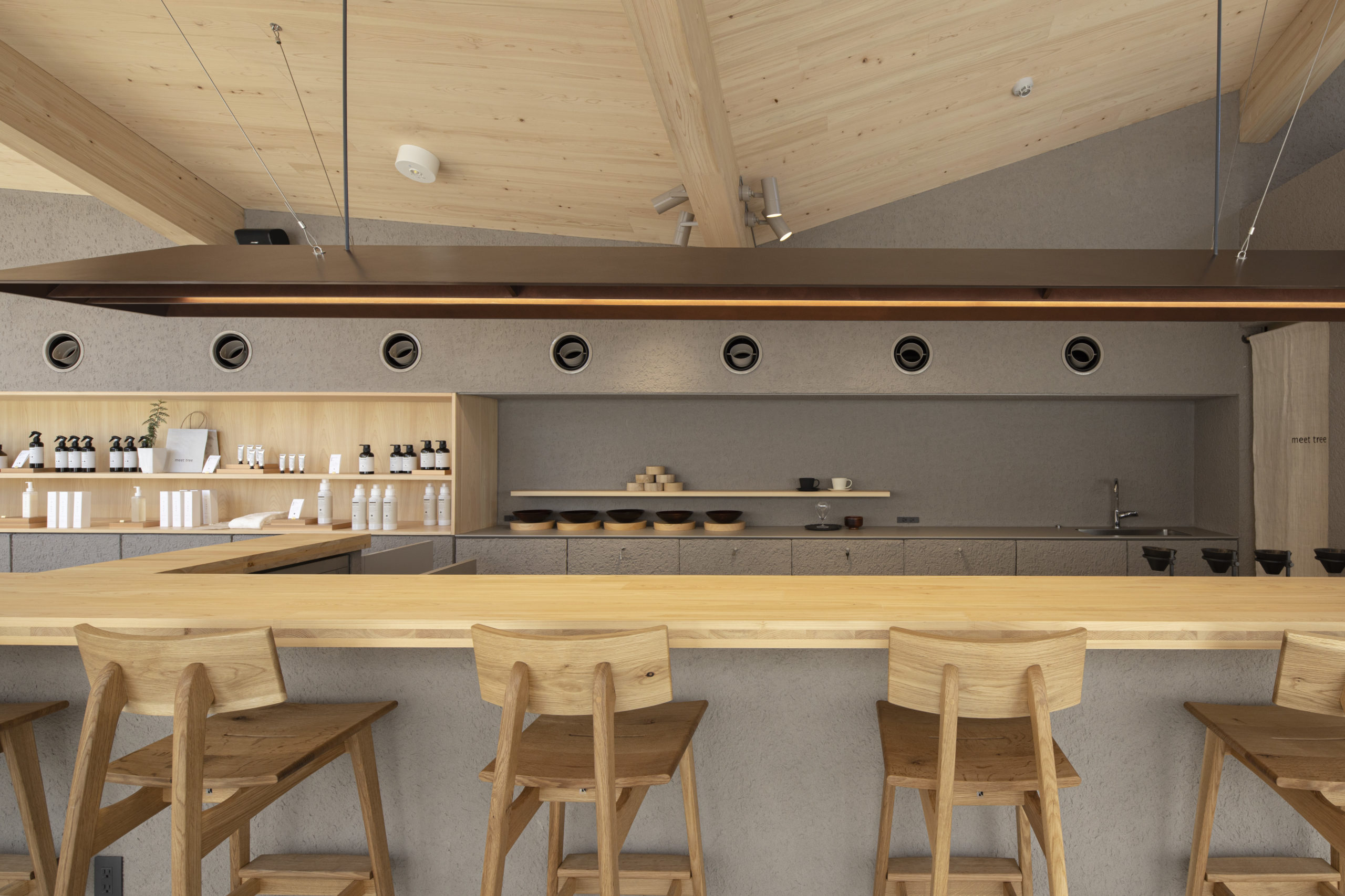桧材を天井やフレームにふんだんに使用し、木のぬくもりを感じられるお店です。