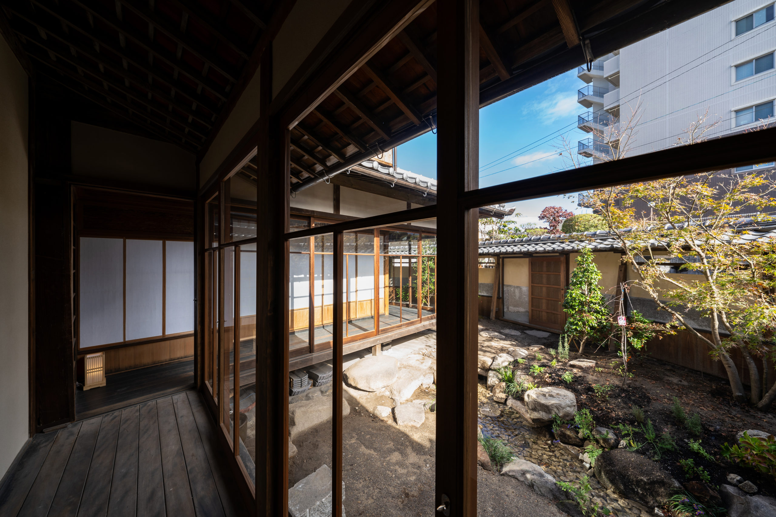 ガラス建具のある長い廊下から見える中庭は、建物同様に和を感じられる造りになっています。