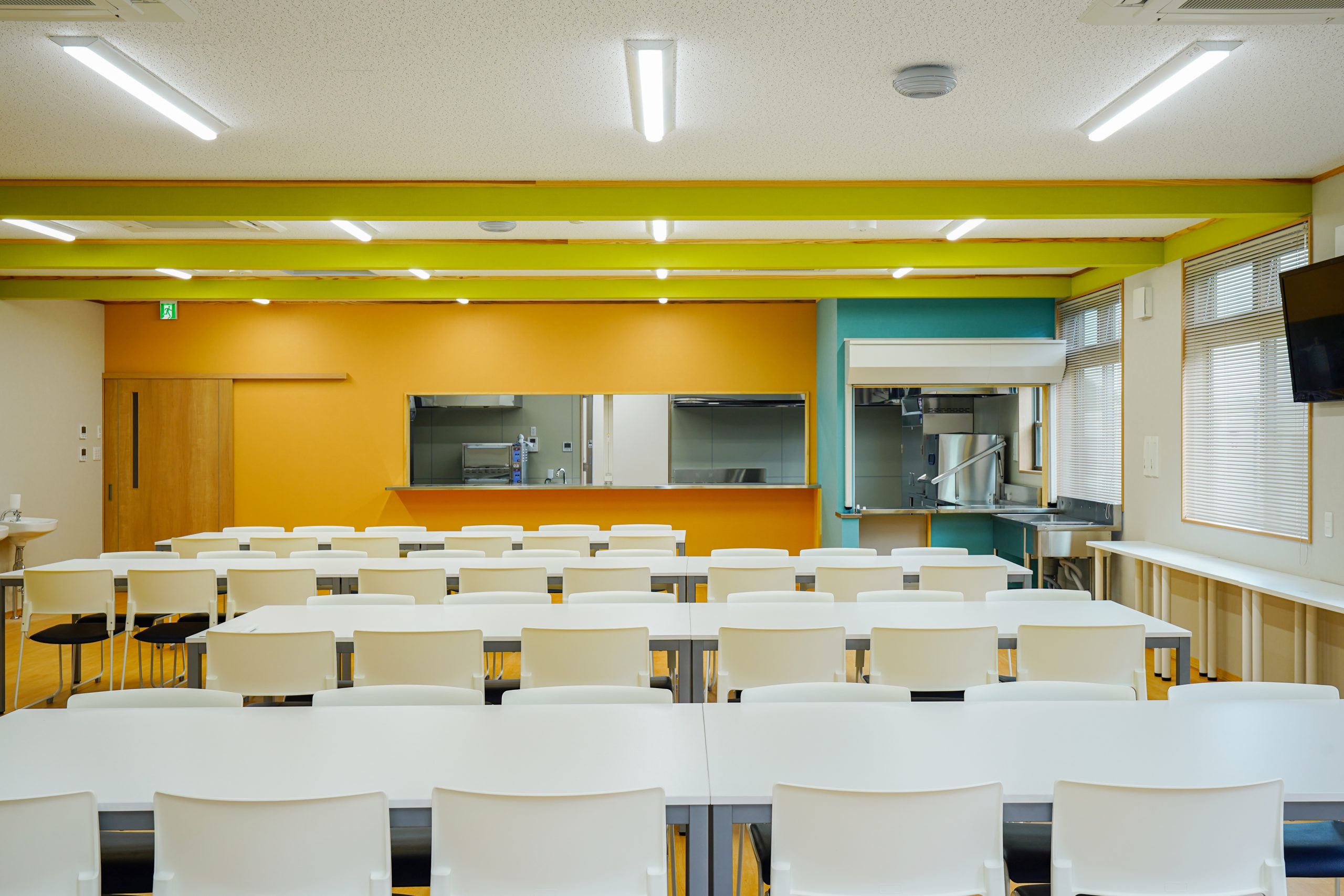 共用棟にある食堂です。厳しい練習や勉学を励む中、広々とした空間で、仲間と共に落ち着いて食事が楽しめる、憩いの時間が過ごせるのではないでしょうか。