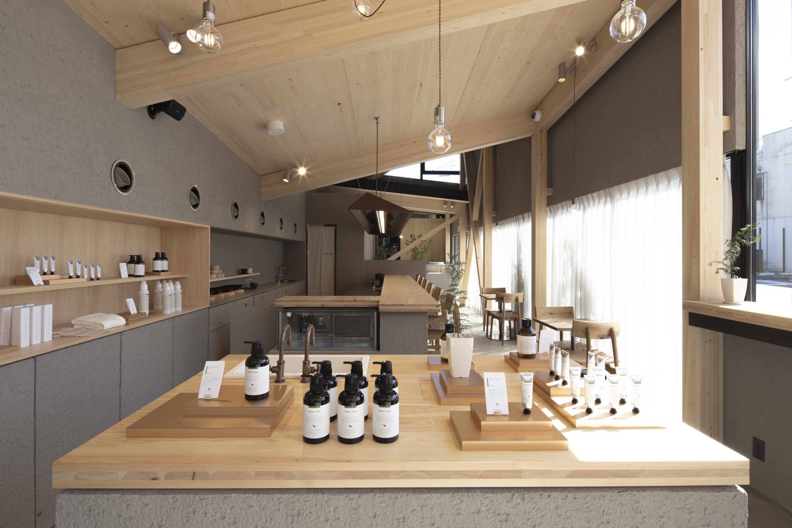 入ってすぐにショップがあり、桧のオイルを原料として作られたシャンプーやコンディショナー、ハンドクリーム等の商品が並んでいます。