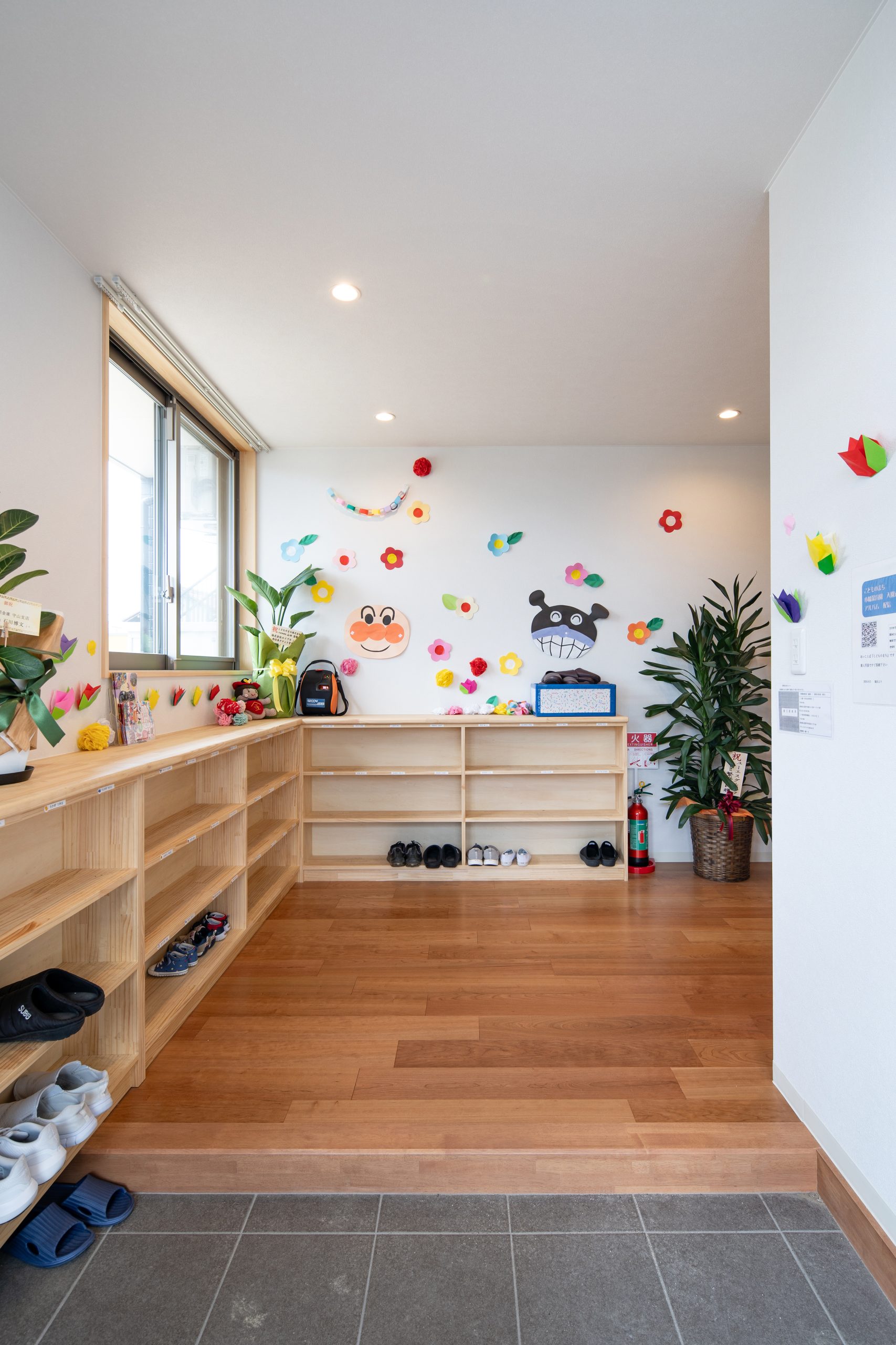 玄関入ってすぐには、木で作られた下足箱があります。木のぬくもりとやさしい雰囲気が感じられます。